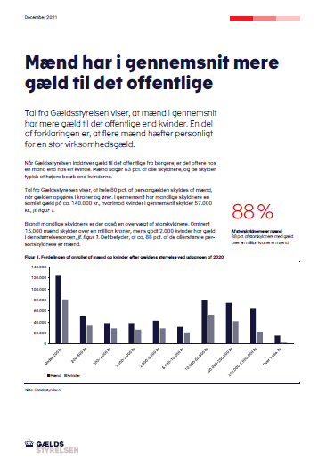 Når Gældsstyrelsen inddriver gæld til det offentlige fra borgere, er det oftere hos en mand end hos en kvinde. Mænd udgør 63 pct. af alle skyldnere, og de skylder typisk et højere beløb end kvinderne.